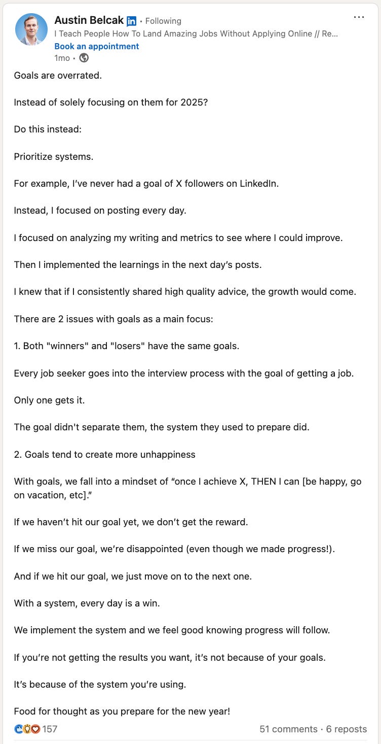 I think Austin hit the nail on the head in highlighting the two main reasons why systems (i.e. process-oriented actions) are superior to goals (i.e. outcome-oriented results).